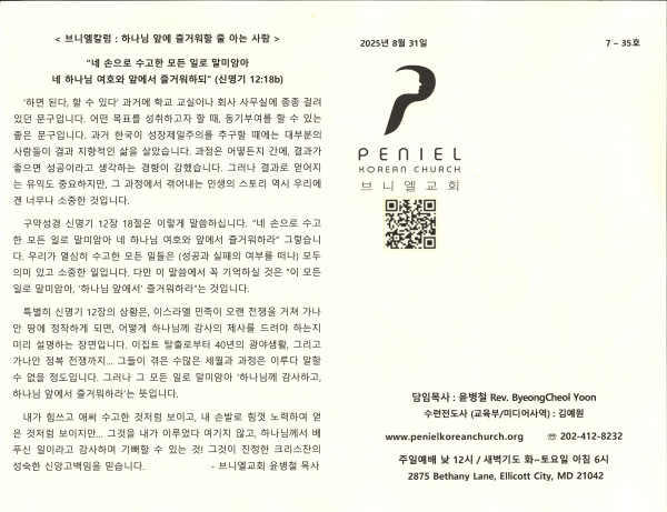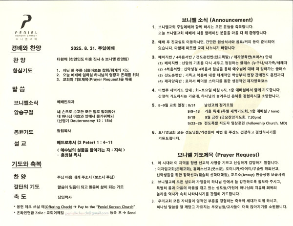 2025년 8월 31일 주보 페이지 정보 작성자 매릴랜드브니엘교회 댓글 0건 조회 196회 작성일 25-09-01 06:47 목록 본문 2025년 8월 31일 주보 이전글2025년 9월 7일 주보 25.09.08 다음글2025년 8월 24일 주보 25.08.24 댓글 0 댓글목록 등록된 댓글이 없습니다. 목록