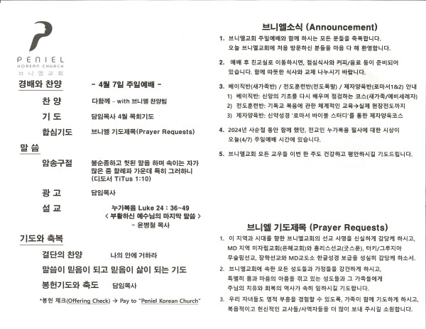 2024년 4월 7일 주보 페이지 정보 작성자 매릴랜드브니엘교회 댓글 0건 조회 539회 작성일 24-04-07 17:59 목록 본문 2024년 4월 7일 주보 이전글2024년 4월 14일 주보 24.04.14 다음글2024년 3월 31일 주보 24.03.31 댓글 0 댓글목록 등록된 댓글이 없습니다. 목록