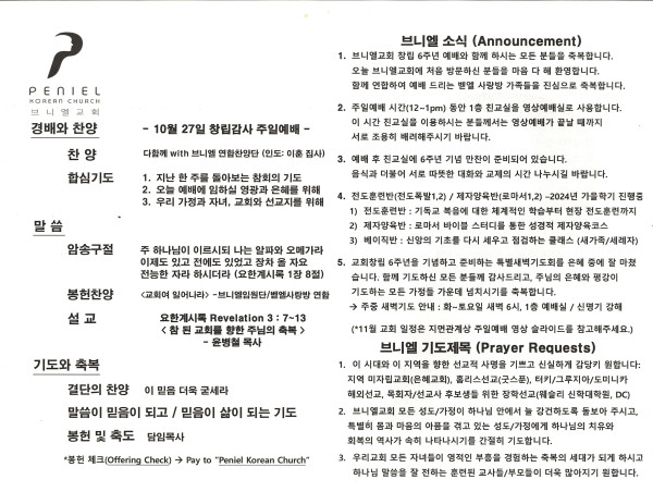 2024년 10월 27일 주보 페이지 정보 작성자 매릴랜드브니엘교회 댓글 0건 조회 466회 작성일 24-10-27 16:12 목록 본문 2024년 10월 27일 주보 이전글2024년 11월 3일 주보 24.11.03 다음글2024년 10월 20일 주보 24.10.20 댓글 0 댓글목록 등록된 댓글이 없습니다. 목록