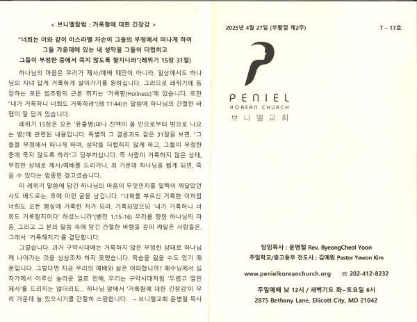 2025년 4월 27일 주보 페이지 정보 작성자 매릴랜드브니엘교회 댓글 0건 조회 343회 작성일 25-04-27 13:34 목록 본문 2025년 4월 27일 주보 이전글2025년 5월 4일 주보 25.05.04 다음글2025년 4월 20일 주보 25.04.20 댓글 0 댓글목록 등록된 댓글이 없습니다. 목록